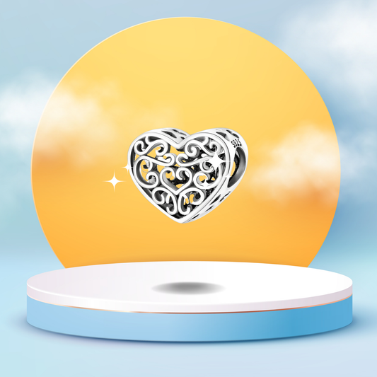 Charm Colgante Corazón Calado con Diseño de Filigrana en Plata de Ley 925 Compatible con Pulseras Europeas