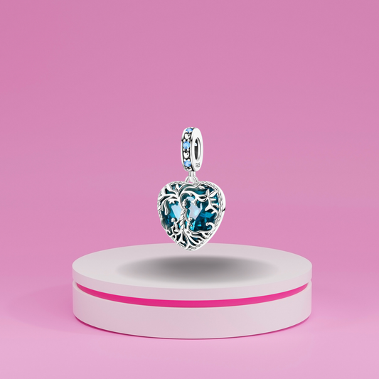 Charm Colgante Corazón con Árbol de la Vida y Cristal Azul en Plata de Ley 925 Compatible con Pulseras Estilo Europeo