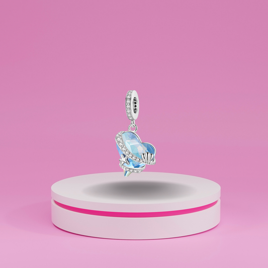 Charm Colgante Corazón de Cristal Azul con Motivos Marinos en Plata de Ley 925 Compatible con Pulseras Europeas