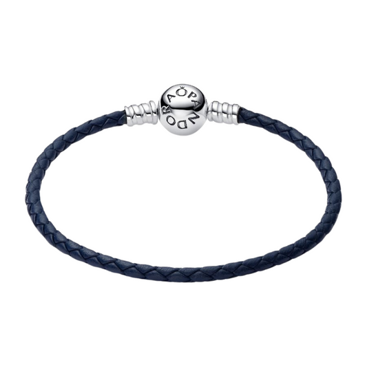Pulsera Pandora de Cuero Trenzado Azul con Cierre Redondo de Pandora Moments - BeJoyasVintage