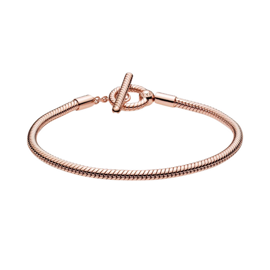 Pulsera Pandora Diseño Cadena de Serpiente Barra en T de Pandora Moments en Color Oro Rosa - BeJoyasVintage